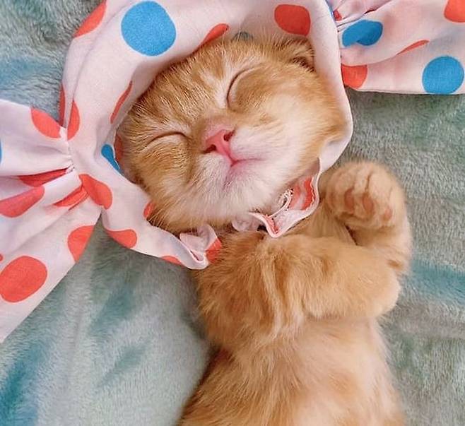 여기에 눈웃음까지 지어 보이며 자는 아기 고양이. 순간 너무 귀여워서 인형이 아닌가 착각이 들게 할 정도인데요.