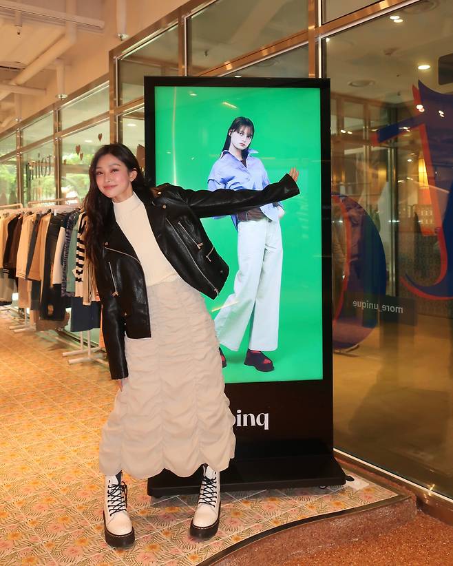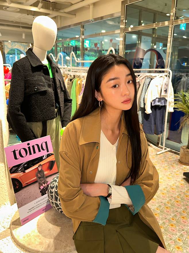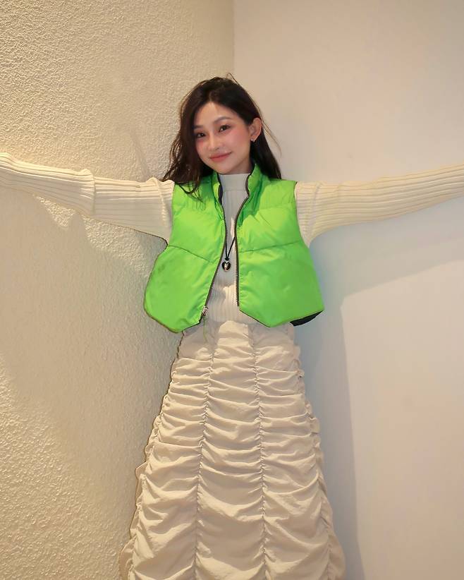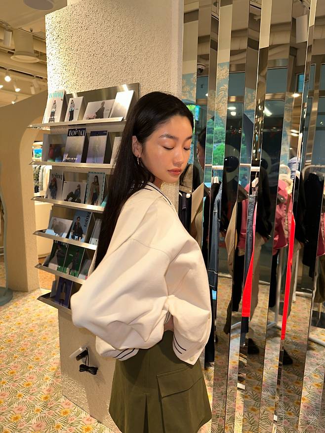 카키색 미니스커트와 매치하여 키치하면서도 통통 튀는 룩을 연출했네요