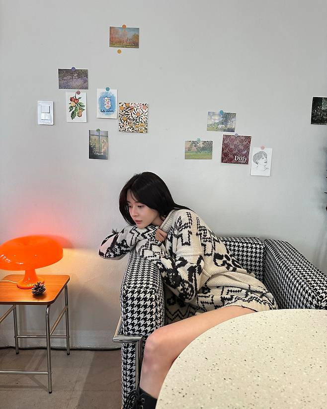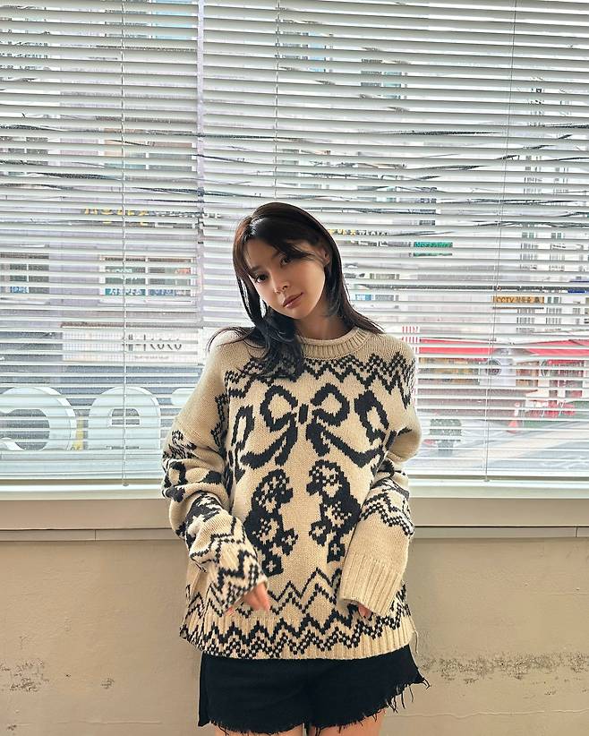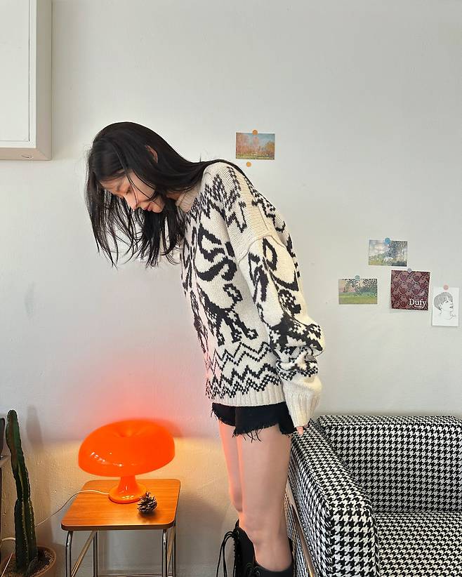 사진 속 권나라는 귀여운 리본 패턴의 니트에 숏팬츠와 롱부츠를 매치한 러블리한 코디를 선보였습니다.