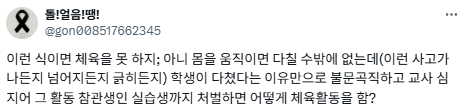 또한 "이러한 사안이 형사 처벌로 이어질 경우 교육 현장 전반에 미칠 파장이 우려된다"며 "체육수업을 비롯한 다양한 교육활동이 심각하게 위축될 수밖에 없으며, 교사들이 학생 안전에 대한 과도한 부담감으로 인해 적극적인 교육 활동을 기피하게 되면 결국 피해는 학생들에게 돌아갈 것"이라고 말했다.