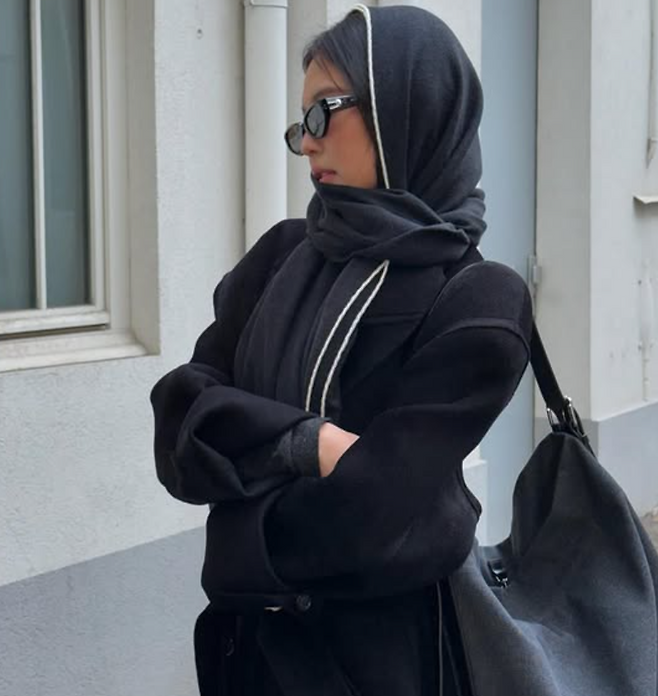 검정색 스카프를 얼굴에 둘러