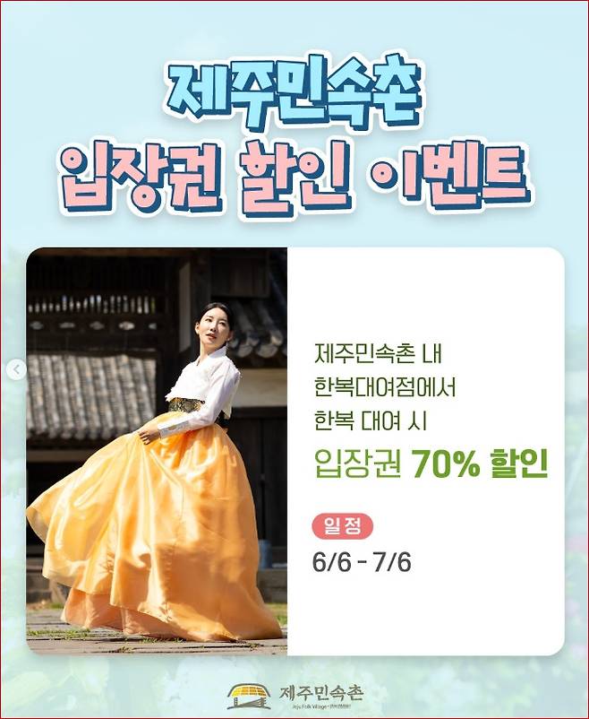 제주민속촌 수국축제에서는 한복대여 할인 혜택도 빼놓을 수 없습니다.민속촌 내 한복대여소에서 한복을 대여하면 입장권이 무려 70% 할인! 수국을 배경으로 전통 복장을 입고 사진을 남긴다면 이번 제주 여행의 로맨틱한 기억으로 오래 간직할 수 있을 겁니다.