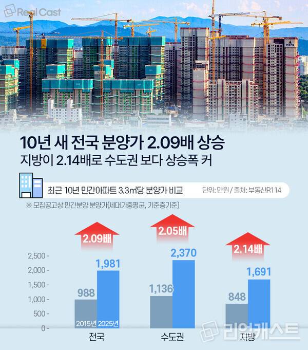 부동산R114가 2015년과 2025년 민간분양 아파트의 3.3㎡당 평균 분양가를 비교한 결과 전국, 수도권, 지방 모두 2배 이상 분양가가 상승한 것으로 나타났습니다.
