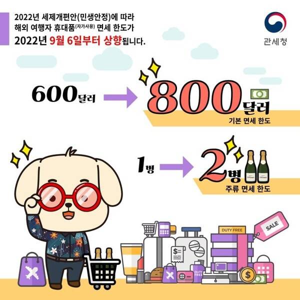 2022년 9월부터 입국 면세한도가 600달러에서 800달러로 늘었습니다. 또 1리터 1병으로 제한했던 술의 별도면세도 400달러 내에서 2리터 2병까지 허용됩니다.