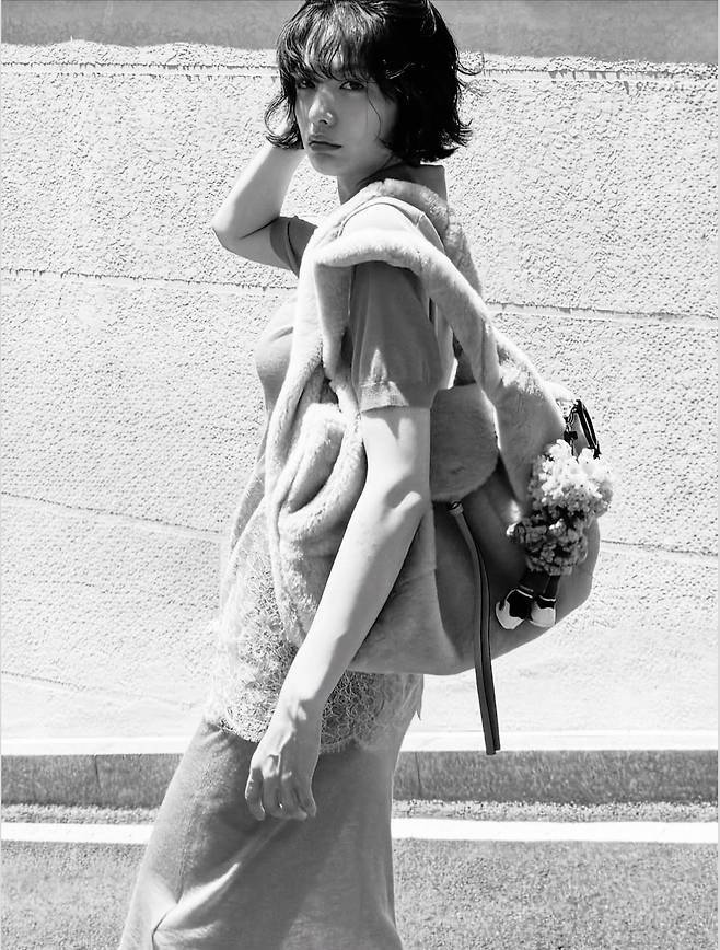 인형 모양 키링과 블랙 선글라스를 더한 오버사이즈 베이지 컬러의 퍼백으로 ‘귀여움과 시크’를 동시에 담아냈습니다.