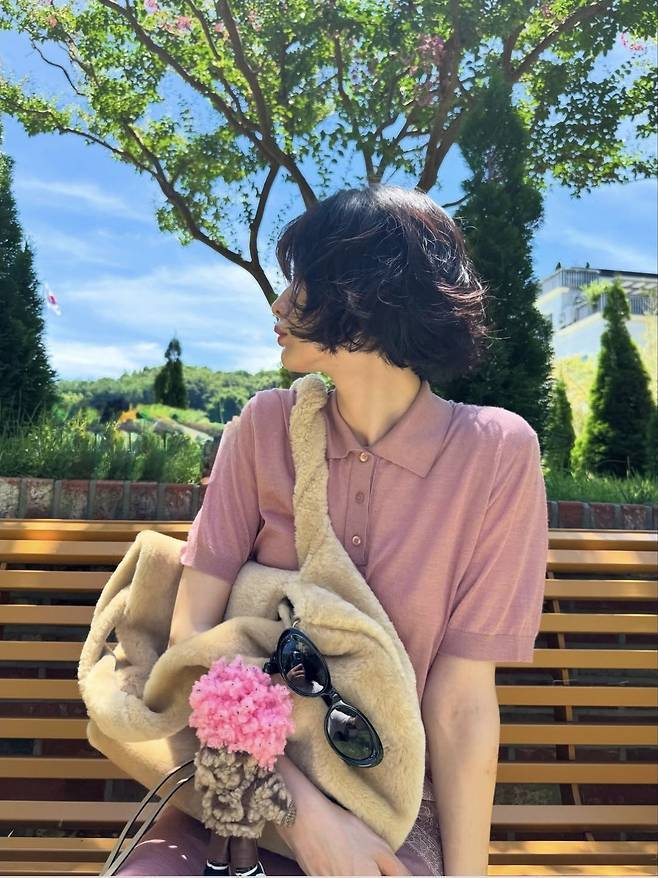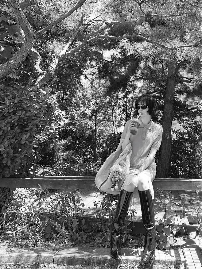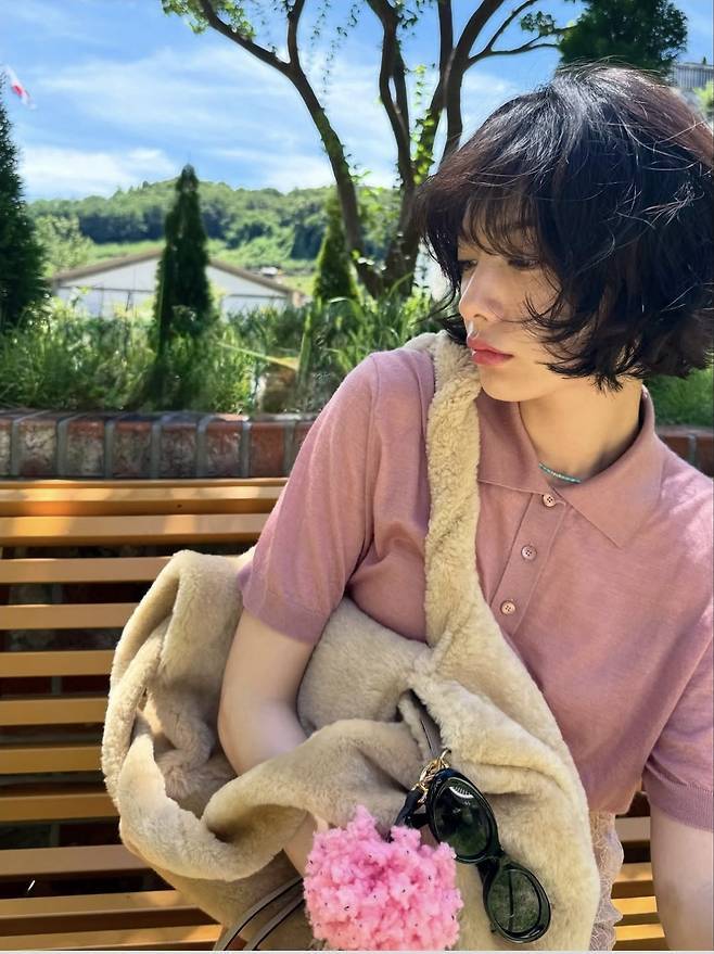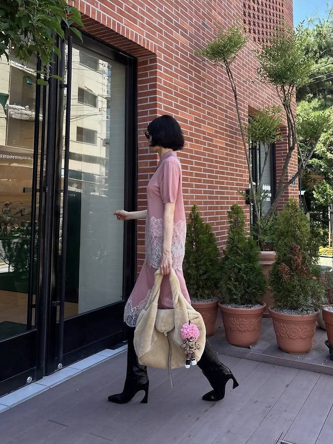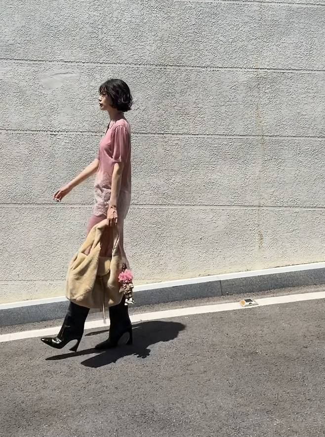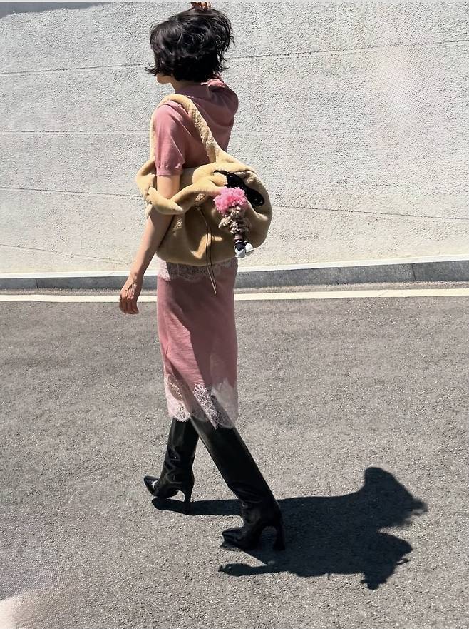 여기에 무릎 위까지 올라오는 블랙 롱부츠를 착용해 핑크의 러블리함에 스트릿 무드를 더했으며, 내추럴한 웨이브 숏컷 헤어스타일과 가벼운 메이크업으로 분위기 있는 데일리룩을 완성했습니다.