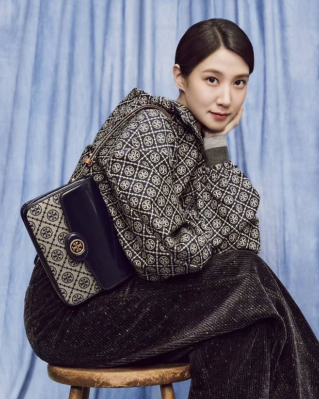 첫 번째 사진에서 박은빈은 전체적으로 모노그램 패턴이 돋보이는 재킷과 가방을 매치하여 세련된 분위기를 연출했다. 재킷과 가방은 동일한 패턴으로 통일감을 주며, 네이비 컬러의 가죽 디테일이 고급스러움을 더한다. 여기에 벨벳 소재로 보이는 팬츠를 더해 텍스처의 대비를 통해 우아함과 편안함을 동시에 잡았다.