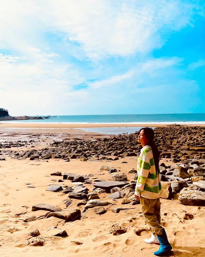 해변에서 여유로운 캐주얼 스타일을 보여준다. 스트라이프 니트와 카고 팬츠의 조합은 편안하면서도 활동적인 느낌을 준다. 여기에 파란색 레인부츠를 더해 자연 속에서의 실용성을 강조했으며, 전체적으로 자유롭고 내추럴한 분위기를 연출했다.