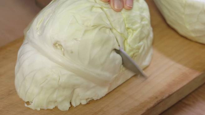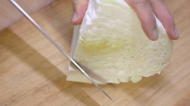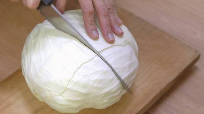 오랫동안 보관하려면 자르는 과정이 참 중요해요. 바로 심지를 중심으로 양배추를 잘라 주어야 해요.