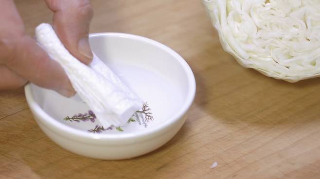양배추를 오래 보관하려면 충분한 수분이 있어야 하는데요. 바로 요 심지를 통해서 수분을 보충해 주면 오래 보관이 가능해서 좋답니다.