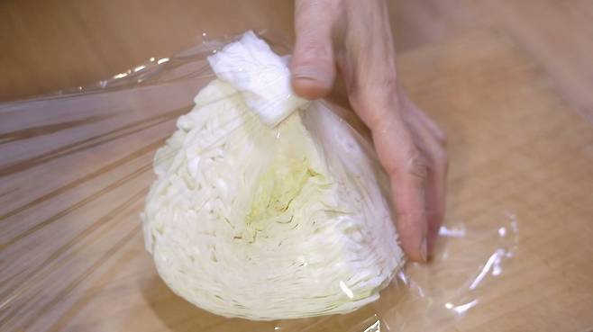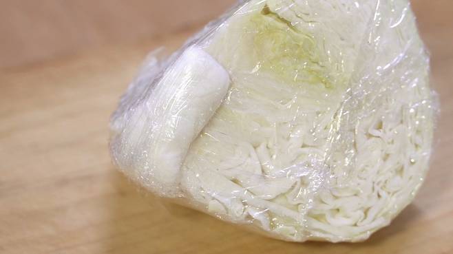 랩을 활용하여 양배추를 감싸 주세요. 이렇게 해야 수분이 빠져나가는 것을 막아 양배추의 변질을 늦출 수 있어요.