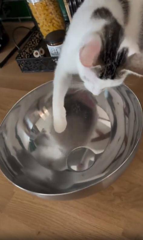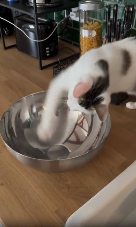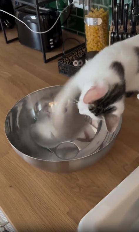 고양이는 그릇에 비친 ‘적’을 향해 기습 냥냥펀치를 날립니다. 하지만 그 적도 질 수 없다며 똑같이 반응하는 듯 보이자, 고양이는 다시 한 번 퍽! 퍽! 두세 번 더 펀치를 연속으로 날립니다. 그릇은 덜그럭거리며 흔들리고, 고양이는 점점 더 혼란스러운 눈빛으로 물러섰다 다시 다가옵니다.
