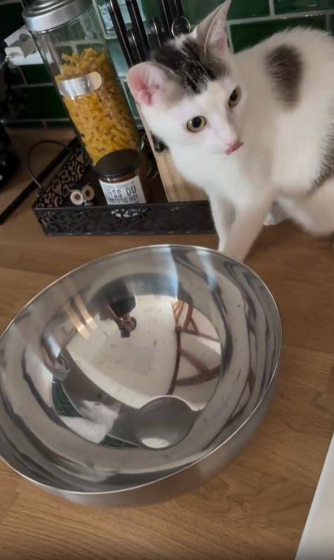 고양이는 그릇을 향해 천천히 다가갑니다. 고개를 살짝 숙였다가, 좌우로 기울이며 자기 얼굴을 이리저리 살펴보죠. 그러다 문득, 그 속에 있는 고양이가 자기를 똑같이 따라하는 걸 눈치채고 말았습니다. “어… 뭐야, 왜 따라 해?” 그 순간 고양이의 전투 본능에 불이 켜집니다.