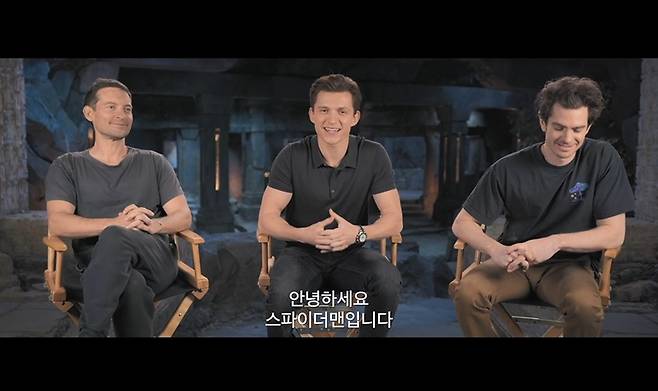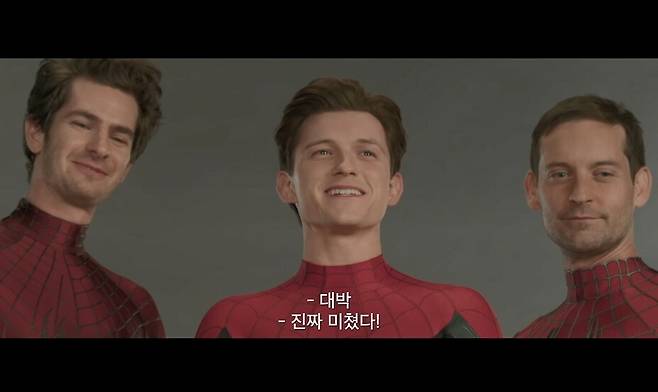 공개된 영상 속 톰 홀랜드와 토비 맥과이어, 앤드류 가필드는 자신이 서로 스파이더맨이라고 소개하며 유쾌한 시작을 알린다. 먼저, 과거 스파이더맨이 되는 것이 꿈이라고 밝힌 바 있던 톰 홀랜드는 1대, 2대 스파이더맨과 어깨를 나란히 하게 된 특별한 소감을 전했다. 특히 “빈털터리 범생이 중에 우리만큼 멋진 사람 있으면 나와 보라고 하라”는 앤드류 가필드는 스크린을 장악할 독보적인 매력을 예고하는 것은 물론, “멀티버스를 제대로 보여주는 멋진 영화”라며 약 20년에 이르는 스파이더맨 세계관을 통합하는 멀티버스에 대한 기대감을 높였다.