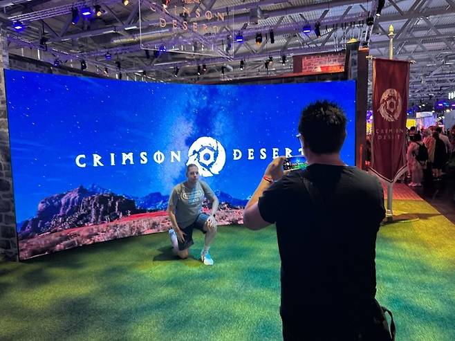게임스컴의 붉은사막 부스는 6홀 메인 통로 양쪽에 2개 부스로 배치해 게임 속 성벽을 형상화한 독특한 디자인으로 꾸몄다. 외부 초대형 스크린 2개를 통해 게임 플레이를 선보이고 부스 정면에 바위에 박힌 검을 포토존으로 설치했다.