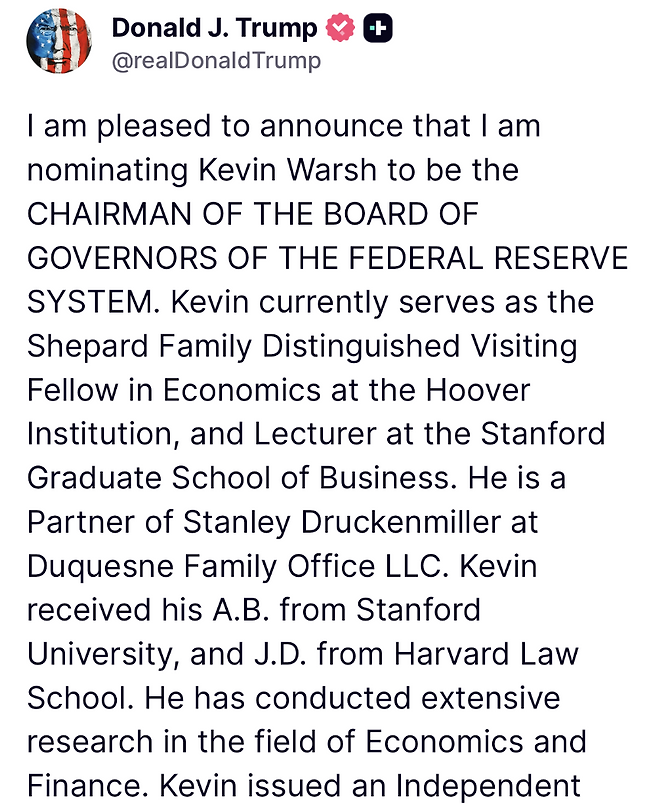 30일(현지시간) 트럼프 대통령은 자신의 소셜미디어를 통해 "케빈 워시를 차기 연준 의장으로 지명한다"며 “케빈을 오랜 기간 알고 지냈으며, 어쩌면 그는 최고의 의장으로 기록될 것”이라고 밝혔다. 트럼프 대통령은 케빈 워시 의장이 “배역에 딱 맞는 인물로 실망시키지 않을 것”이라고 덧붙였다.