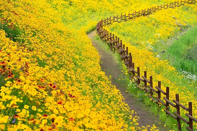 특히 5월 말부터는 공원 전역에 금계국이 피기 시작한다. 꽃들은 길을 따라 일렬로 피어나며, 햇빛에 반사되어 황금빛 파도를 이루고, 바람이 불면 그 파도는 살랑이며 리듬을 만든다. 마치 누군가 섬세하게 배치한 듯하지만, 자연의 무질서가 주는 감동이 곳곳에 묻어난다.