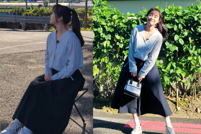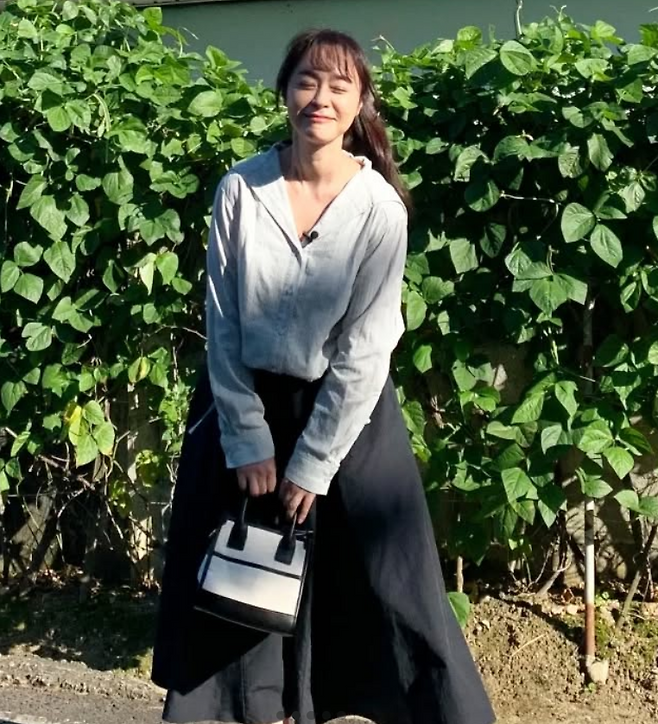 우희진은 블루 셔츠와 플레어 롱스커트를 매치해 여성스러운 분위기를 자아냈습니다. 롱스커트는 우아하면서도 편안한 느낌을 주며, 그녀의 매력을 더욱 돋보이게 만들었습니다. 머리는 포니테일로 묶어 상큼발랄한 느낌을 주었고, 미니 핸드백을 들고 전체적으로 깔끔하면서도 세련된 스타일을 완성했습니다.