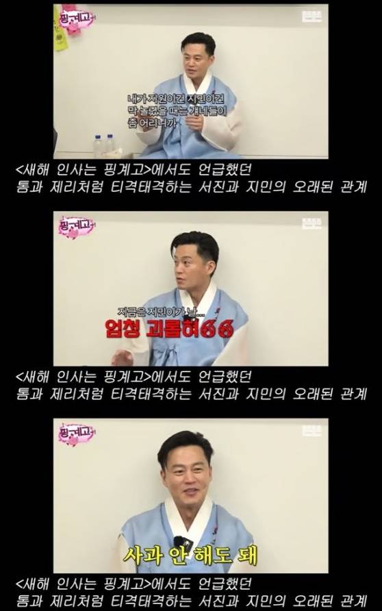 이날 녹화 초반 이서진 얘기가 나오자 유재석은 앞서 '핑계고'에 이서진이 출연해했던 해명을 전했습니다. 유재석은 "(이서진이) '사람들이 내가 지민이를 녹화할 때 이렇게 저렇게 장난쳐가지고 지민이가 속상하다고 얘기를 하는데 사실은 지민이한테 내가 많이 당한다'고 했다"고 말했습니다.