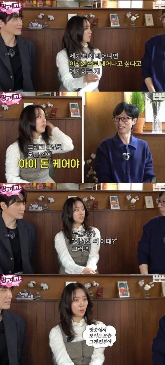 이를 들은 유재석이 "그 형이 음식을 사줘도 기분이 좋지 않게 '먹을래?'라고 한다"라며 이서진이 '겉차속따'(겉은 차갑지만 속은 따뜻한) 유형이라고 설명했습니다. 한지민은 이에 멈추지 않고 "저는 항상 다시 태어나면 이서진으로 태어나겠다고 한다. 근심 걱정이 없다. 그리고 그렇게 모든 일에 '아이 돈 케어'다. '선배님 스트레스가 있나?' 할 정도로"라고 말했습니다.