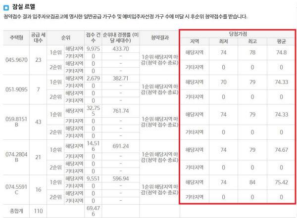 최저 가점과 같은 점수를 보유했으나, 예비 번호를 받은 사례도 있다. 동점일 경우에는 청약통장 가입일 등을 기준으로 순위를 매긴다. ‘잠실 르엘’ 59㎡B 한 청약자는 “같은 74점이라도 결과가 다르다”라며 “2010년 이전 통장을 보유한 동점자가 당첨됐고, 저는 예비 번호를 받았다”고 했다.