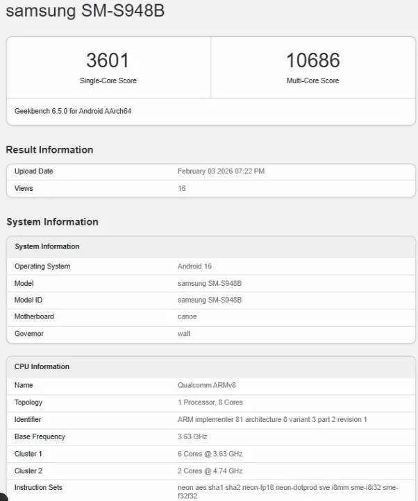 긱벤치 6.5 테스트 결과에 따르면, 갤럭시 S26 울트라는 싱글코어 3601점, 멀티코어 10,686점을 기록했다.