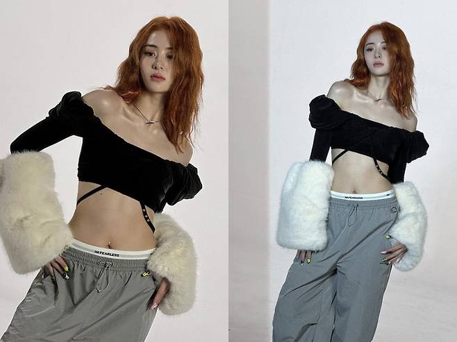 특히 잘록한 허리라인과 일자 쇄골라인으로 워너비 몸매를 자랑하고 있다. 또 헐렁한 캐부얼 팬츠와 팔을 감싼 퍼 장식으로 섹시하면서도 개성있는 스타일링을 완성했다.