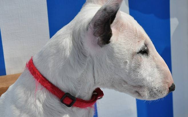 불 테리어는 이마부터 코까지 굴곡 없이 일자로 이어지는 독특한 모양의 머리를 가지고 있어요. 옆에서 보면 마치 달걀 모양 같다고 해서 '달걀 머리'라고도 불립니다.