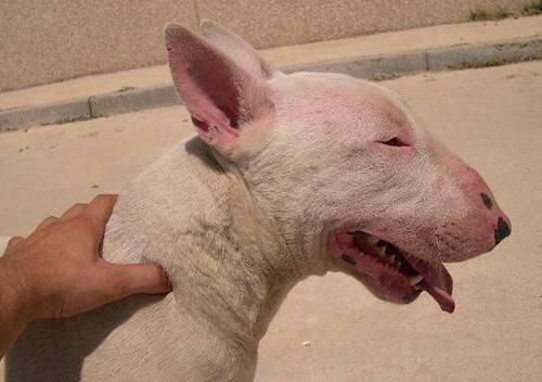 불 테리어는 피부가 약한 편으로 알려져 있어요. 특히, 흰 털을 가진 불테리어의 피부가 특히 예민하다고 합니다. 피부가 약해 쉽게 자극을 받기 때문에 염증, 발진 등의 증상이 일어나기 쉽습니다. 또한, 꽃가루나 먼지, 세제나 플라스틱 속 화학 물질 등으로 인한 알레르기성 피부염 발병률도 높아요.