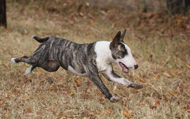 불 테리어는 근육질 몸에 튼튼한 뼈를 가진 에너지 넘치는 견종이에요. 다리는 조금 짧은 편이지만, 매우 민첩합니다. 최소 1시간 정도의 산책이 필요하다고 알려져 있으며, 격한 운동도 좋아해요. 또, 정신적인 자극역시 필요해 머리를 쓸 수 있는 활동을 시켜주는 것도 중요합니다.