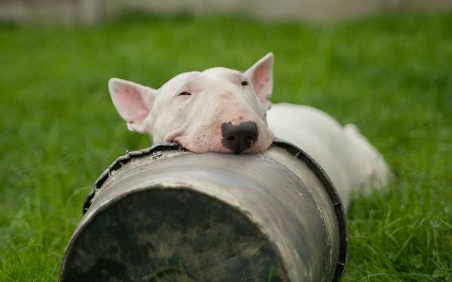 불 테리어는 장난기가 아주 많은 편이에요. 개의 탈의 쓴 어린이(The kid in a dog suit)라는 별명도 가지고 있답니다. 장난감을 가지고 함께 노는 걸 굉장히 좋아하며, 도그 스포츠에도 재능이 있는 견종으로 알려져 있어요.