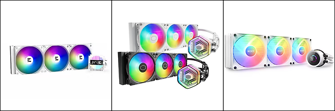 20만 원을 훌쩍 넘는 고가형 제품으로는 NZXT 크라켄 360 RGB, 커세어 iCUE 링크 타이탄 360 RX LCD, 리안리 하이드로쉬프트 LCD 360RGB, 딥쿨 미스틱큐 360 등이 유명하며 이들 제품은 모두 화이트 모델이 존재하기 때문에 디자인 취향에 따라 선택하시면 됩니다.