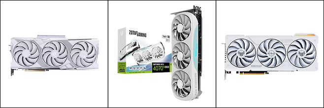 RTX 4060 화이트 형제들입니다. 평범하게 장착할 때(옆모습이 보일 때)는 이엠텍 RTX 4060 미라클 화이트(실시간 438,690원)가 무난무난하고 예쁘다는 평이죠. 측면에 무려 LED가 있다구요.