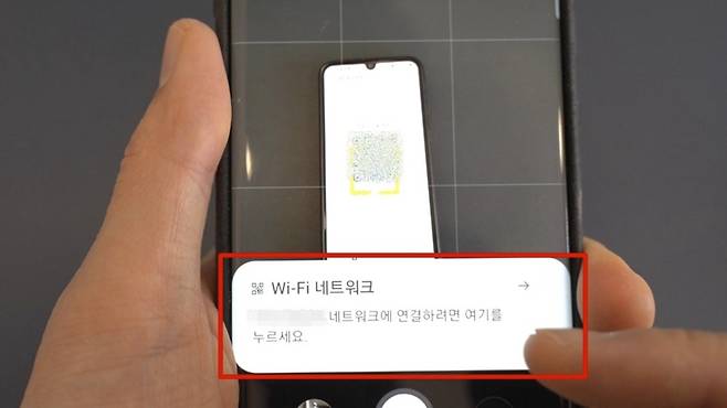 상대방의 스마트폰 카메라를 이용해 QR코드를 찍어 주세요. 그러면 Wi-Fi 네트워크 연결 알림이 뜨게 되는데요. 이때 이 버튼을 눌러 접속하면 된답니다.