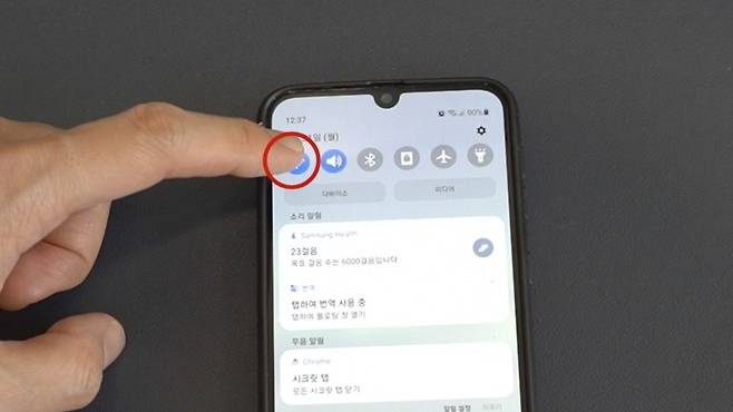 스마트폰을 켜고 윗부분에서 아랫부분으로 쓸어내려 주세요. 그러면 사진과 같이 정보가 나오게 되는데요. 이때 와이파이 버튼을 길게 눌러 줍니다.