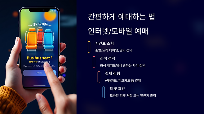 좌석 선택 후에는 결제 단계로 넘어갑니다. 신용카드, 체크카드 등 다양한 결제 수단을 이용하여 요금을 결제할 수 있습니다. 결제가 완료되면 모바일 티켓 또는 예매 확인 정보를 받게 됩니다. 모바일 티켓은 스마트폰에 저장하여 버스 탑승 시 운전기사에게 제시하면 됩니다. 예매 확인 정보(예매 번호 등)가 있는 경우, 터미널에 있는 무인 발권기에서 실물 티켓을 출력할 수 있습니다. 인터넷/모바일 예매는 시간과 장소에 구애받지 않고 언제 어디서든 편리하게 이용할 수 있다는 큰 장점이 있습니다. 특히 원하는 시간대의 좌석이 매진되기 전에 미리미리 예매할 수 있어 안심하고 여행을 준비할 수 있습니다. 스마트폰 사용이 익숙하다면 모바일 앱을 활용하는 것이 가장 간편합니다.