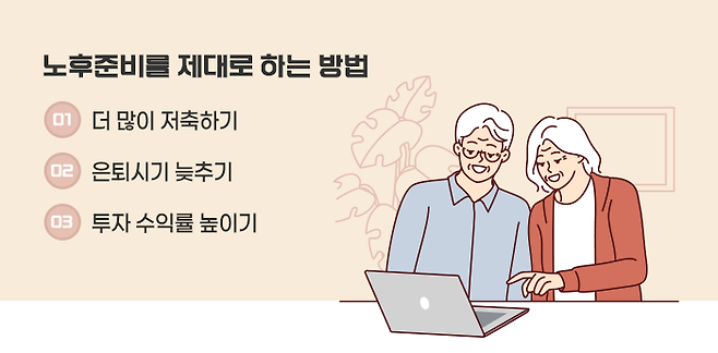 노후준비를 제대로 하려면 더 많이 저축하거나, 은퇴시기를 늦추거나, 투자 수익률을 높여야 합니다.