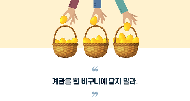 계란을 한 곳에 몰아서 보관하면 실수로 떨어뜨렸을 때 전부 깨질 수 있듯이, 투자할 때도 한 자산에 몰아넣지 말라는 얘기입니다.