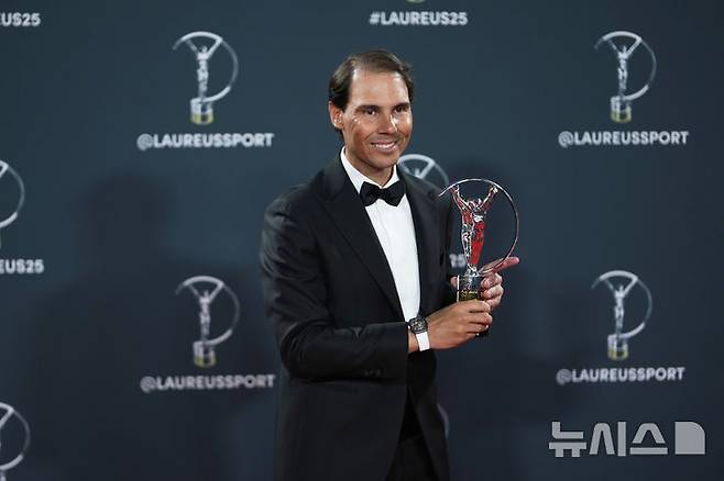 [마드리드=AP/뉴시스] '흙신' 라파엘 나달(스페인)이 21일(현지 시간) 스페인 마드리드에서 열린 2025 라우레우스 월드 스포츠 시상식에서 '스포츠 아이콘' 상을 받은 후 트로피를 들고 포즈를 취하고 있다. 2025.04.22.