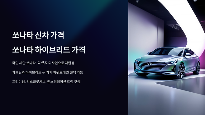 '국민 세단', '중형 세단의 표준'. 수식어가 필요 없을 정도로 우리에게 익숙하고 오랫동안 사랑받아 온 자동차, 바로 현대 쏘나타입니다. 시대를 거듭하며 끊임없이 진화해 온 쏘나타는 최근 미래지향적인 디자인 '디 엣지(The Edge)'를 입고 다시 한번 주목받고 있습니다. 스타일리시한 외관뿐만 아니라 실용적인 공간, 편안한 승차감, 그리고 뛰어난 연비의 쏘나타 하이브리드 모델까지 갖추며 폭넓은 소비자층을 만족시키고 있는데요. 새로운 쏘나타 구매를 고려하시는 분들이라면 단연 신차 가격과 하이브리드 모델의 가격 정보가 가장 궁금하실 겁니다. 이 글에서는 쏘나타 디 엣지의 매력 포인트와 함께 가솔린 모델과 하이브리드 모델의 가격 정보, 주요 제원 등을 살펴보고, 가장 정확한 가격표를 확인하는 방법까지 안내해 드리겠습니다.