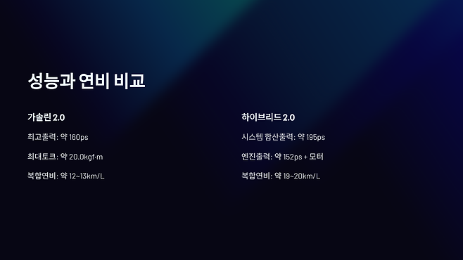 핵심 제원 비교: 성능과 연비 (가솔린 vs 하이브리드)