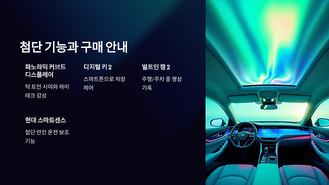 쏘나타 디 엣지는 단순히 디자인만 바뀐 것이 아니라, 최첨단 편의 및 안전 사양으로 무장하여 더욱 스마트해졌습니다. 현대자동차의 지능형 안전 기술인 **'현대 스마트센스'**가 기본 또는 선택 사양으로 폭넓게 적용되어 전방/후측방 충돌 방지 보조, 스마트 크루즈 컨트롤, 고속도로 주행 보조 등 안전한 운전을 돕습니다. 실내에는 운전석부터 중앙까지 부드럽게 이어지는 파노라믹 커브드 디스플레이가 적용되어 탁 트인 시야와 하이테크한 감성을 제공합니다. 또한, 무선(OTA) 소프트웨어 업데이트, 스마트폰으로 차량 제어가 가능한 디지털 키 2, 빌트인 캠 2, BOSE 프리미엄 사운드 시스템 등 다채로운 첨단 기능들을 경험할 수 있습니다.)