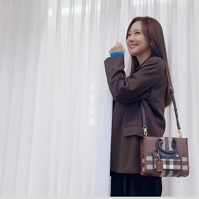 소유진은 부드러운 브라운 톤의 오버이즈 블레이저와 아이코닉한 체크 패턴이 돋보이는 백으로 클래식한 매력을 극대화했습니다.