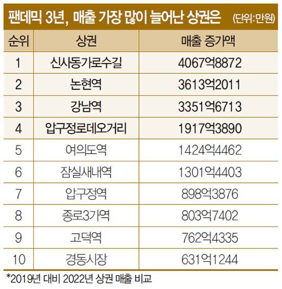 가로수길뿐 아니라 논현역 상권 매출도 부쩍 늘었다. 2019년 대비 2022년 매출이 3613억원 증가해 뒤를 이었다. 지하철 7호선 역세권인 논현역 상권은 다른 강남 상권과 비교하면 유동인구가 적어 분위기가 한산했지만 신분당선 개통 이후 분위기가 달라졌다. 20~30대 젊은 층 유동인구가 늘면서 매출이 치솟았다.