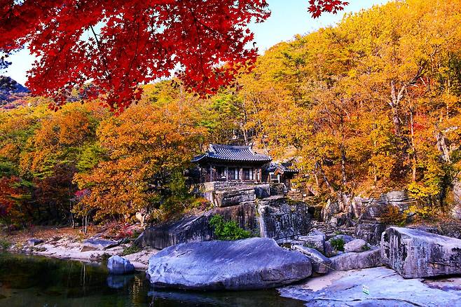 국립공원인 화양동 계곡의 제4곡 금사담 옆 절벽 위에 자리 잡고 있으며, 주변의 바위 사이에는 울창한 노송이 자생하고, 아래로는 맑은 물이 흐르며 층암절벽이 어우러져 환상적인 가을 경치를 만들어냅니다. 송시열 선생이 느꼈던 고요한 학문의 세계와 가을의 정취에 빠져보세요.