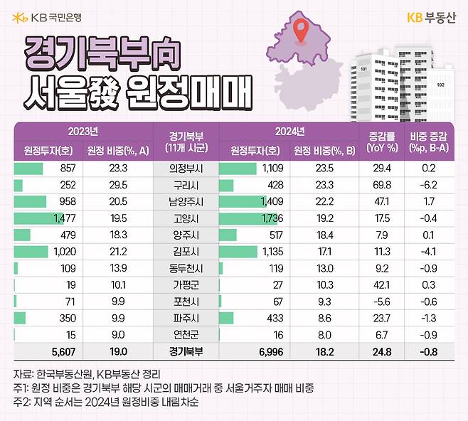경기도 아파트 매매거래는 2023년 10.4만호에서 2024년 13.4만호로 28% 증가했습니다. 이 중 경기북부는 2023년 3.0만호에서 2024년 3.9만호로 30% 증가해 경기 평균보다 높죠. 동기간 서울발 원정매매(서울發→경기向)는 2023년 1.3만호에서 2024년 1.7만호로 27% 늘어났습니다.
