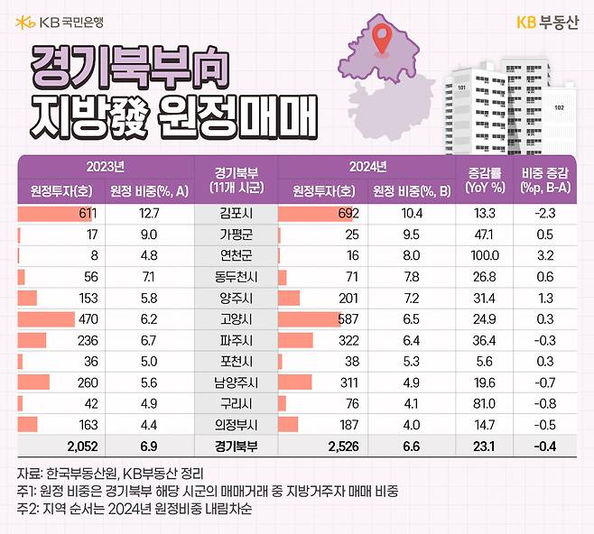 경기북부에 대한 지방발 원정매매(지방發→경기북부向)는 2023년 2,052호에서 2024년 2,526호로 23% 늘었습니다. 동기간 경기북부에 대한 서울발 원정매매(서울發→경기북부向) 증가율 25%보다 다소 낮은 증가율이지만, 경기도에 대한 지방 거주자 관심 역시 만만치 않음을 보여줍니다.