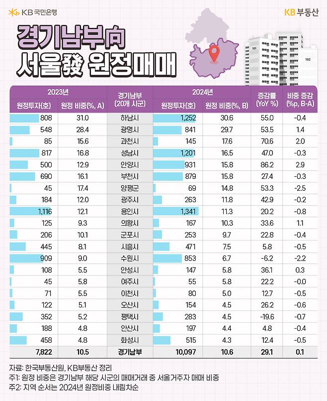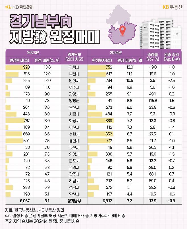 경기남부에 대한 지방발 원정매매(지방發→경기남부向)는 2023년 6,067호에서 2024년 6,912호로 14% 늘었습니다. 동기간 경기남부에 대한 서울발 원정매매(서울發→경기남부向) 증가율 29%보다 낮은 증가율입니다. 경기남부 시세 상승부담이 지방거주자의 소극적 투자를 유도한 것입니다.