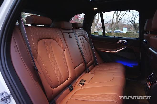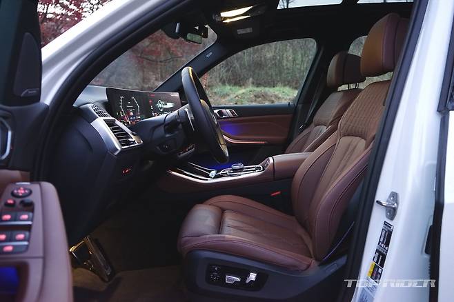 X5 50e 시트 포지션은 세그먼트 SUV 중에서도 낮은 편에 속한다. 시트 착좌감은 1열과 2열 모두 훌륭하다. 1열 시트는 허벅지 부분 길이 조절이 가능하며, 헤드레스트도 전동으로 움직인다. 2열 헤드룸 공간은 상당히 여유롭고, 2열 레그룸은 차체 크기 대비 좁게 느껴진다.
