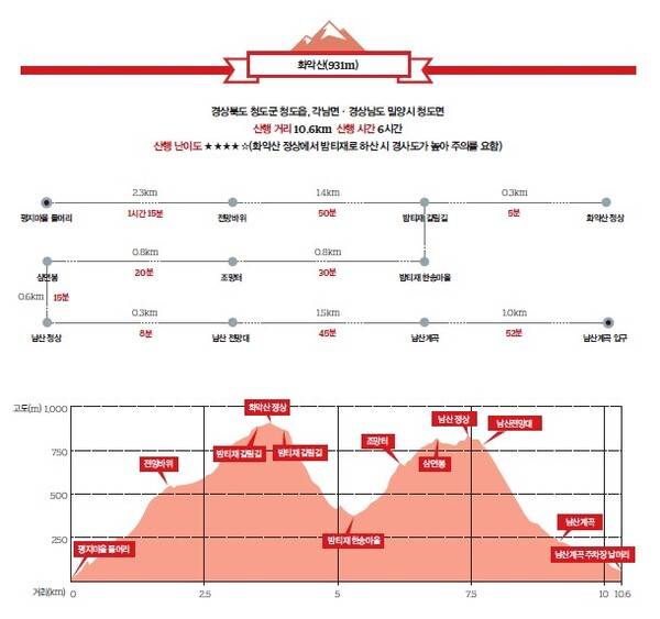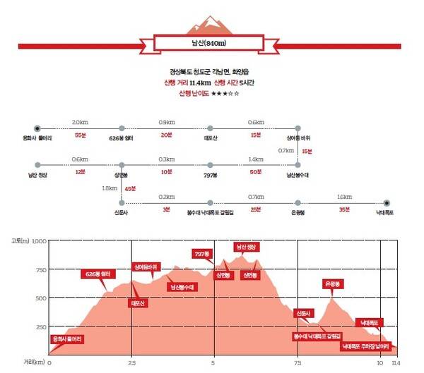화악산 정상에서 밤티재로 하산 시 급경사에 조심해야 한다. 남산은 등산로가 잘 다듬어져 있고, 조망이 탁월한 구간이 많은 데다 아기자기한 풍광을 자랑하는 남산계곡에서 조상이 남긴 문화예술혼을 음미할 수 있는 묘미를 지닌 산이다.